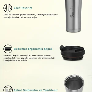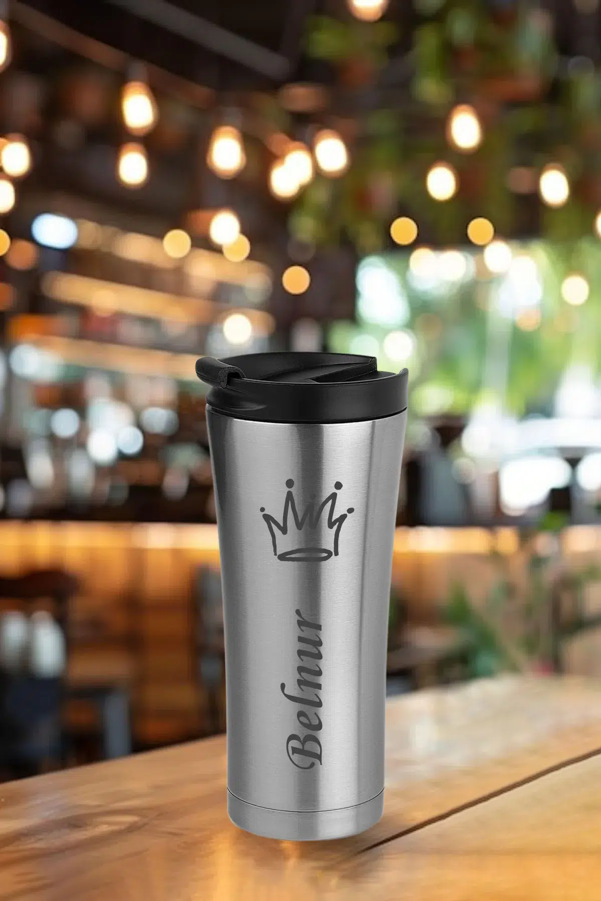 Kişiye Özel Isim Baskılı 500 Ml Çift Katmanlı 304 Çelik Kaydırmaz Taban Araç Termos Mug Coffee – Gümüş