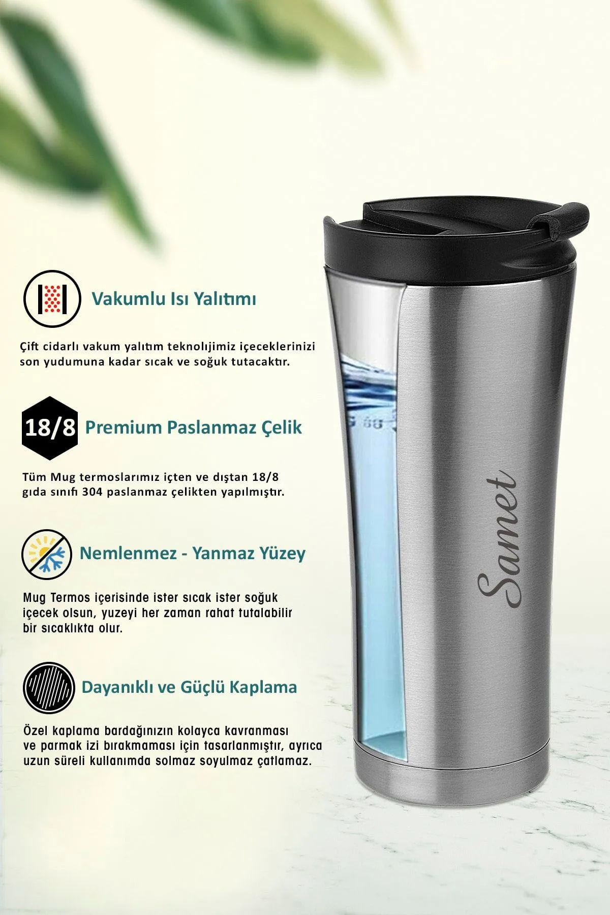 Kişiye Özel Isim Baskılı 500 Ml Çift  Katmanlı 304 Çelik Kaydırmaz Taban Araç Termos Mug Coffee - Gümüş