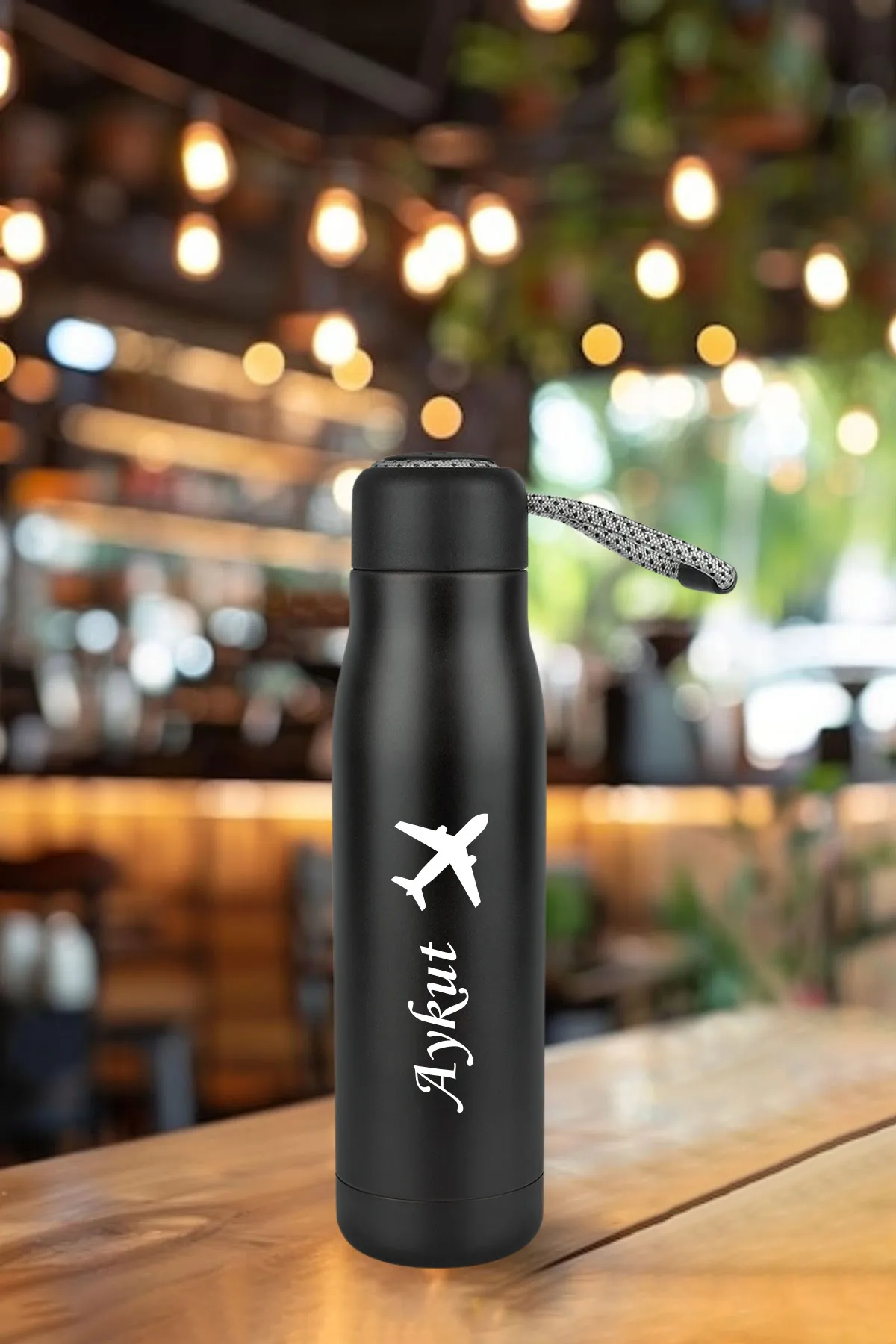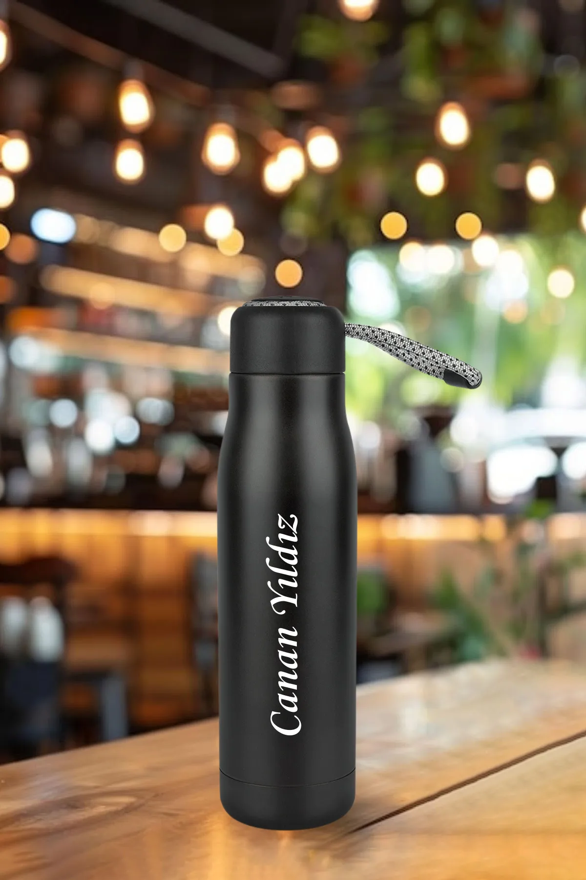 Kişiye Özel Isimli Baskılı Termos 600 ml Çift Katmanlı 304 Çelik Taşıma Ipli Termos Mug Matara – Siyah