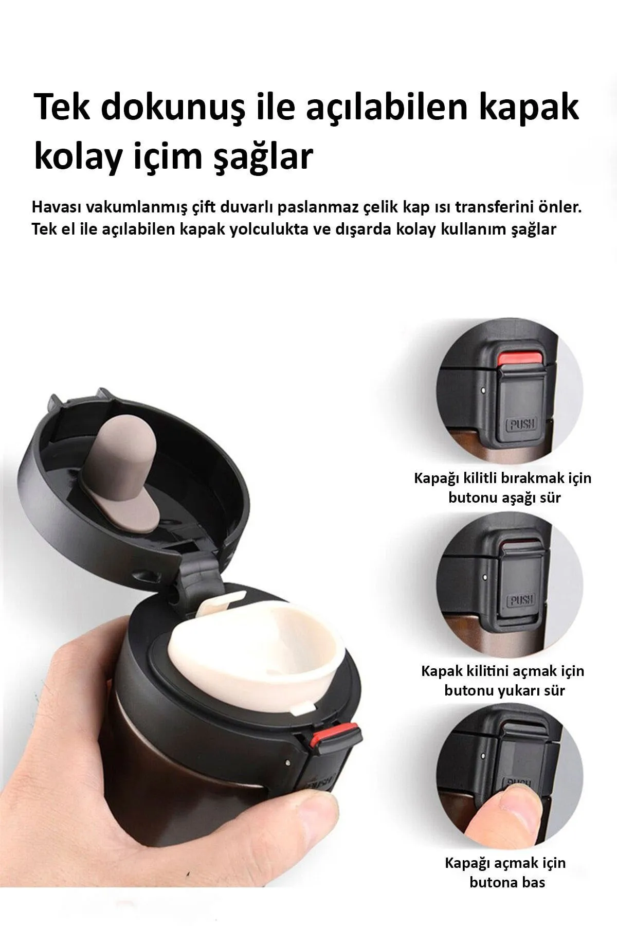 Kişiye Özel Termos 380 ML Öne Çıkan Özellikler UV ve Lazer baskıya uygun.; Kapak kilidi ve tuş mekanizmalı açılır kapak.; 2 katmanlı hassas teknoloji, ısı ve soğuk yalıtımlı.; İç kısmındaki filtre 304 çelikten üretilmiştir.; 4 ile 8 saat arası sıcak-soğuk tutma özelliği.; Kullanım Talimatları Ürünü elde yıkayınız.; Kimyasal madde kullanmaktan kaçının.; Fırın ve mikrodalga uygun değildir.; Renkli ürünlerde dikkatli yıkama yapınız.; Araç kullanırken kapağı kapalı tutunuz.; Paslanma ve Güvenlik Uyarıları Rutubet, paslanmayı tetikler.; Nemli bırakmayınız, iyice kurutunuz.; Sütlü ve gazlı içecekler leke yapabilir.; Kapak, sıcak sıvılarla kullanılırken yavaşça açılmalıdır.; Çocuklardan uzak tutunuz.